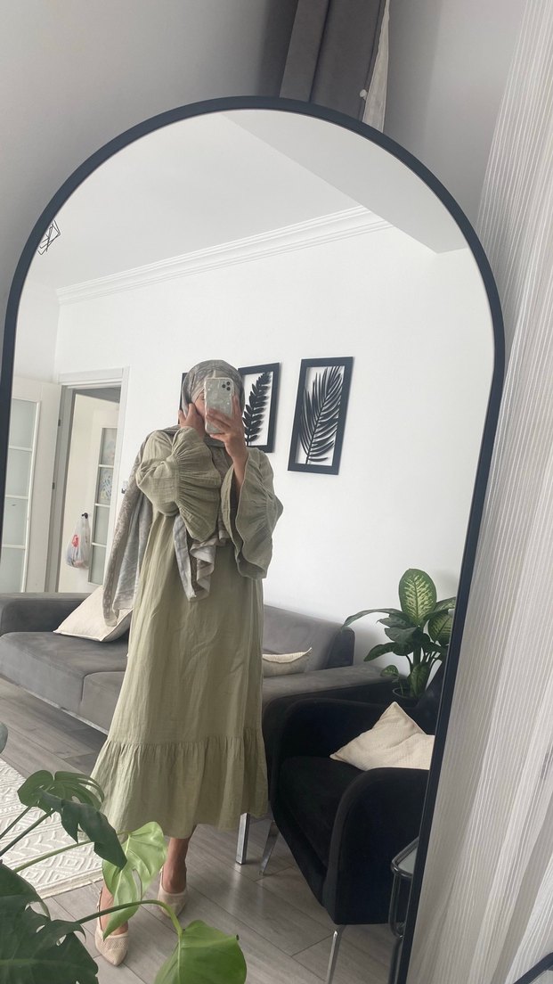 Salaş kesim, keten kumaştan yapılmış, yüksek yakalı ve uzun kollu, drapeli tasarıma sahip haki renk uzun elbise.
