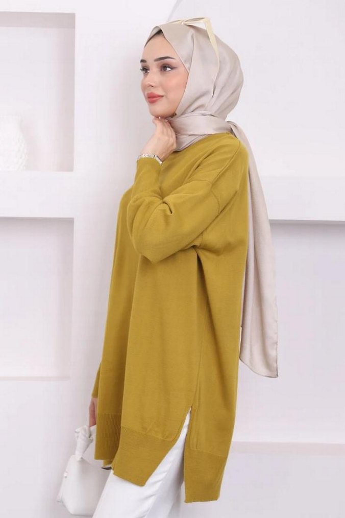 Haki renkte, uzun kollu, yuvarlak yakalı midi boy salaş tunik. İpeksi dokusuyla rahat ve sade şıklık sunar, günlük sokak stiline uygundur. standart Beden sıfir