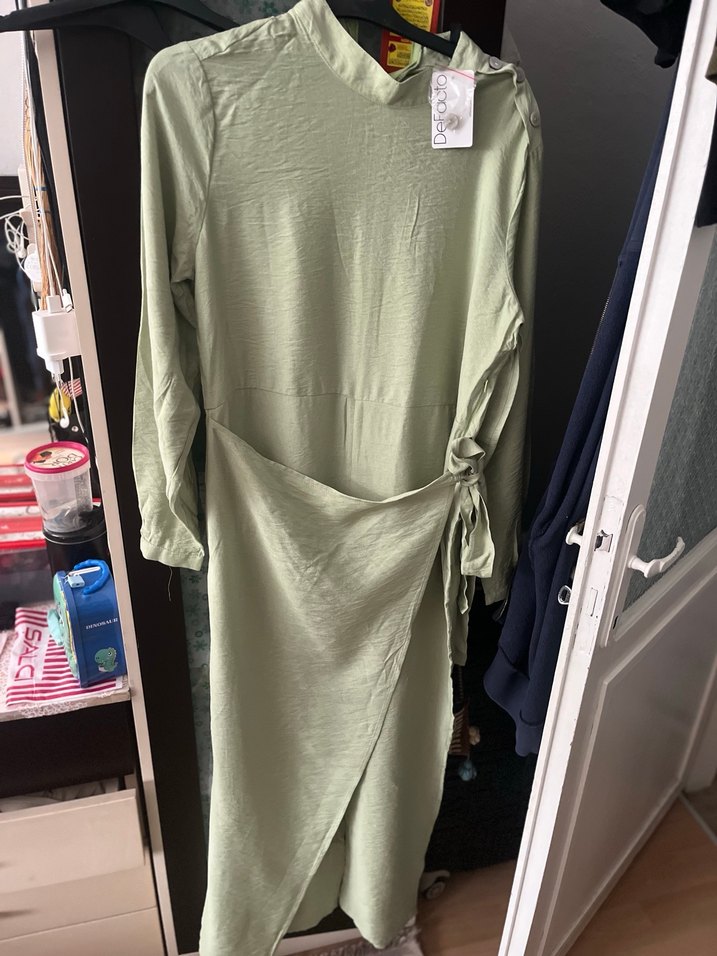 Yüksek yakalı, uzun kollu, salaş kesim, drapeli ve ipeksi kumaştan uzun khaki elbise, günlük sokak stili için uygundur.