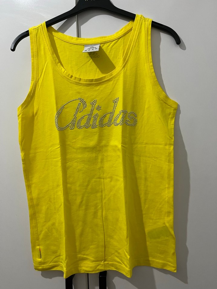 Sarı, pamuklu, bol kesim Adidas baskılı, yuvarlak yaka, kolsuz atlet. Parlak baskılı logo spor tarzı yansıtıyor. ♀️