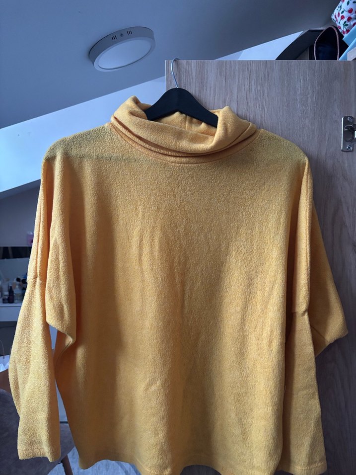Bu kadın kazak, bol kesim ve uzun kollu olup parlak sarı renktedir. Balıkçı yaka ve örme dokusuyla günlük kullanım için rahat ve sade bir stil sunar.