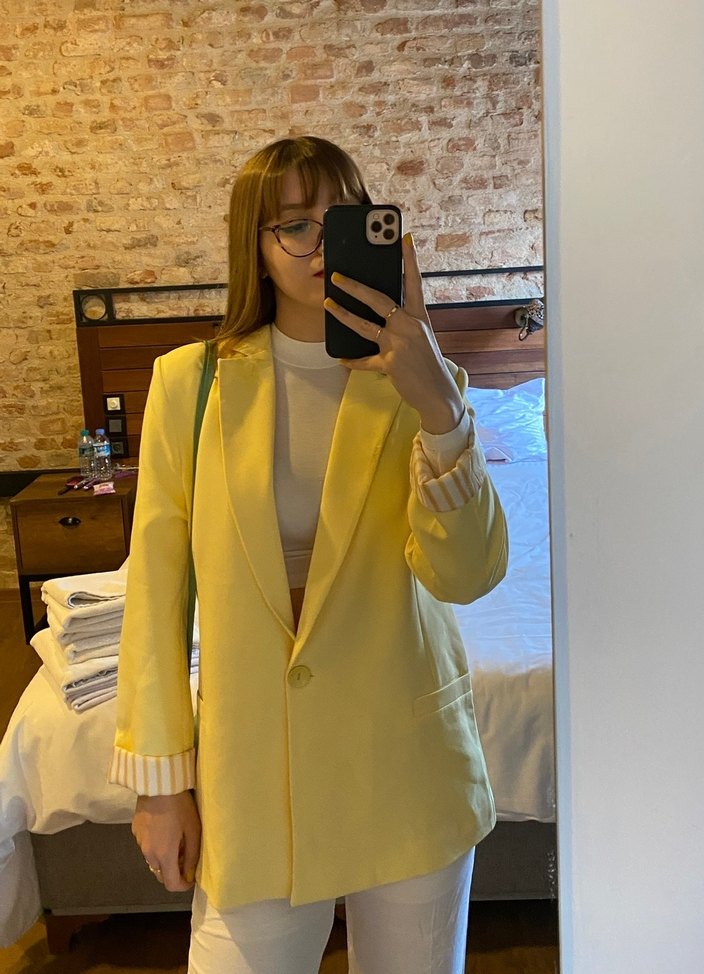 ütülerken sağ yakasında ufak siyahlık izi kaldı ütünün altı sıkıntılıymış ama üstümde duruşunda gördüğünüz gibi pek belli olmuyor. Kadınlar için sarı blazer, notlu yaka ve uzun kollu. İpeksi dokusu ve düzenli kesimiyle ofis için rahat ve şık bir görünüm sunar. Desensiz, trend casual tarzına uygun.