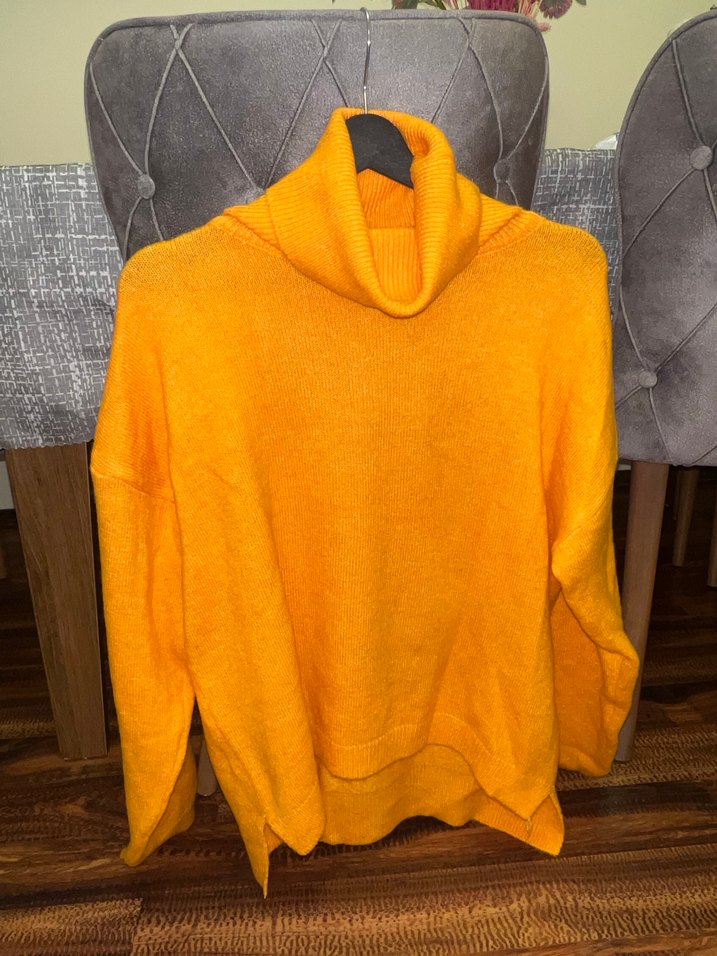 Yumuşak ve sıcak örgü kumaştan, boğazlı ve uzun kollu, bol kesim sarı kazak. Rahat ve şık günlük sokak stili için uygundur.