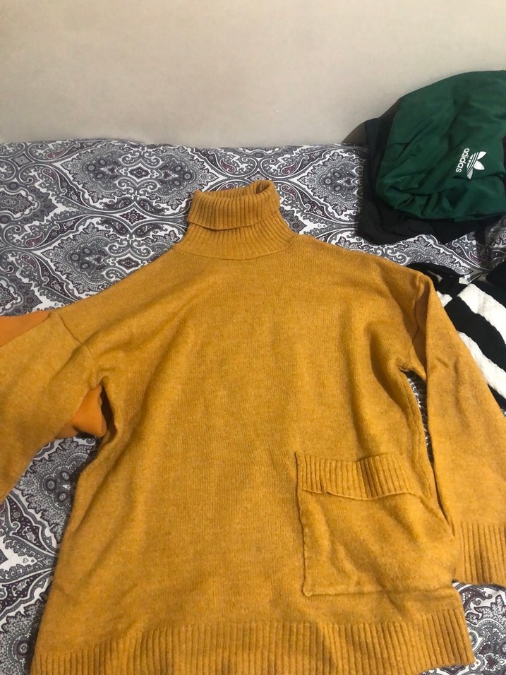 Kadınlar için boğazlı, bol kesim, uzun kollu sarı triko kazak. Yumuşak dokulu, midi boyda ve cep detaylıdır. Günlük rahat kullanım için uygundur.