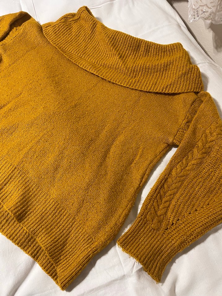 Sarı renkli, örgü kumaştan yapılmış, kayık yaka ve uzun kollu, bol kesim bohem tarzda rahat bir kazak.