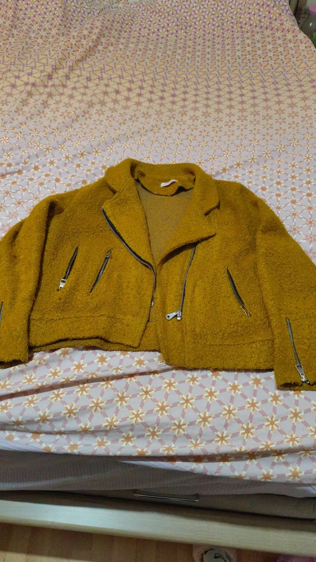 Kadınlar için parlak sarı renkte, yumuşak ve rahat kumaştan yapılmış fermuarlı midi ceket. Notlu yaka, uzun kollu ve bol kesimdir. Sokak stiline uygundur.