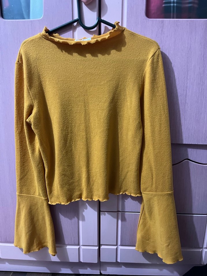 Kadın sarı triko kazak, uzun kollu, fırfırlı boğazlı ve normal boyda bol kesim. Günlük kullanım için rahat, desen içermeyen tasarım.