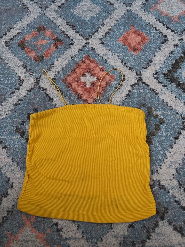 Kadın için ince askılı, sarı renkte, vücuda oturan pamuklu kumaştan atlet. Rahat ve sade bir tasarıma sahiptir.
