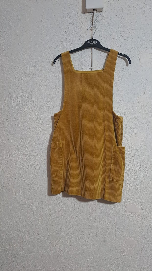 Sarı renkli, kolsuz ve bol kesim keten midi elbise. Yuvarlak yakalı, günlük sokak stiline uygun rahat bir tasarım.