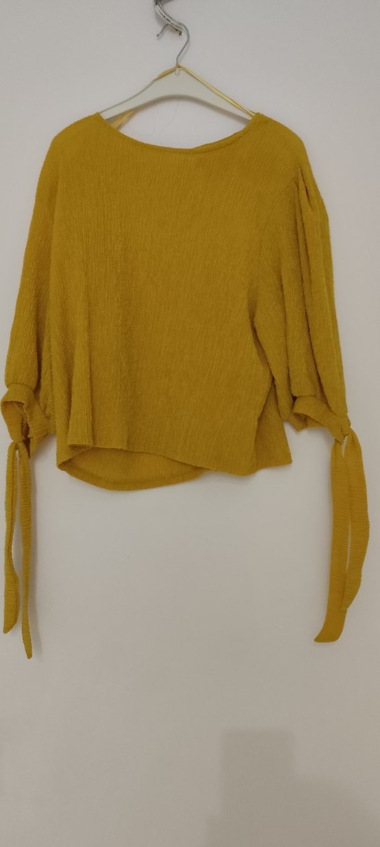 Kadınlar için keten kumaştan, bol kesim ve uzun kollu, bağcıklı sarı triko kazak. Bohem tarzda, günlük kullanıma uygun rahat bir modeldir.