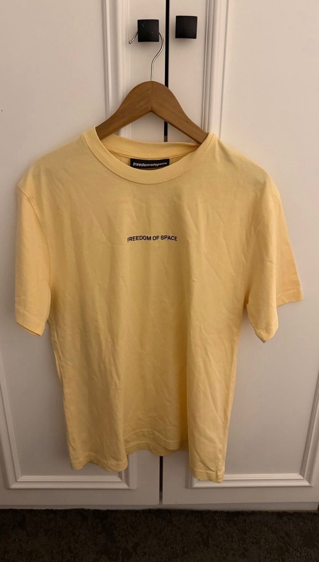 Kadınlar için sarı renkte, kısa kollu ve yuvarlak yakalı pamuklu tişört. Önünde "FREEDOM OF SPACE" baskısı bulunan rahat kesim bir model.