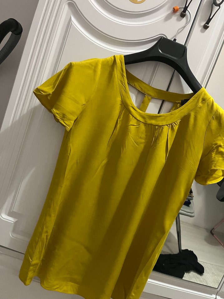 Kadınlar için kısa kollu, yuvarlak yakalı, pilili detaylı, ipeksi kumaştan yapılmış, bol kesim ve parlak sarı renkte bluz. Xs ama S m giyenler tercih edebilir