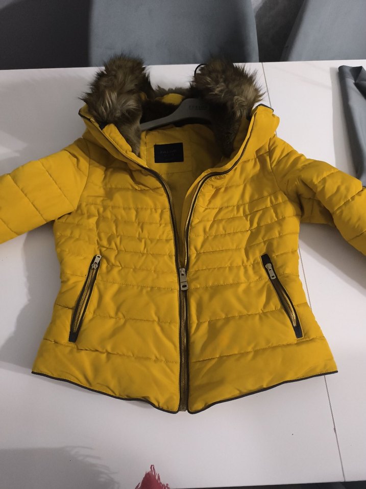 Kadınlar için sarı, parlak görünümlü, kürk detaylı kapüşonlu, yumuşak ve sıcak kumaştan normal uzunlukta, dar kesim kışlık mont. Fermuarlı ceplidir, günlük kullanım için uygun.