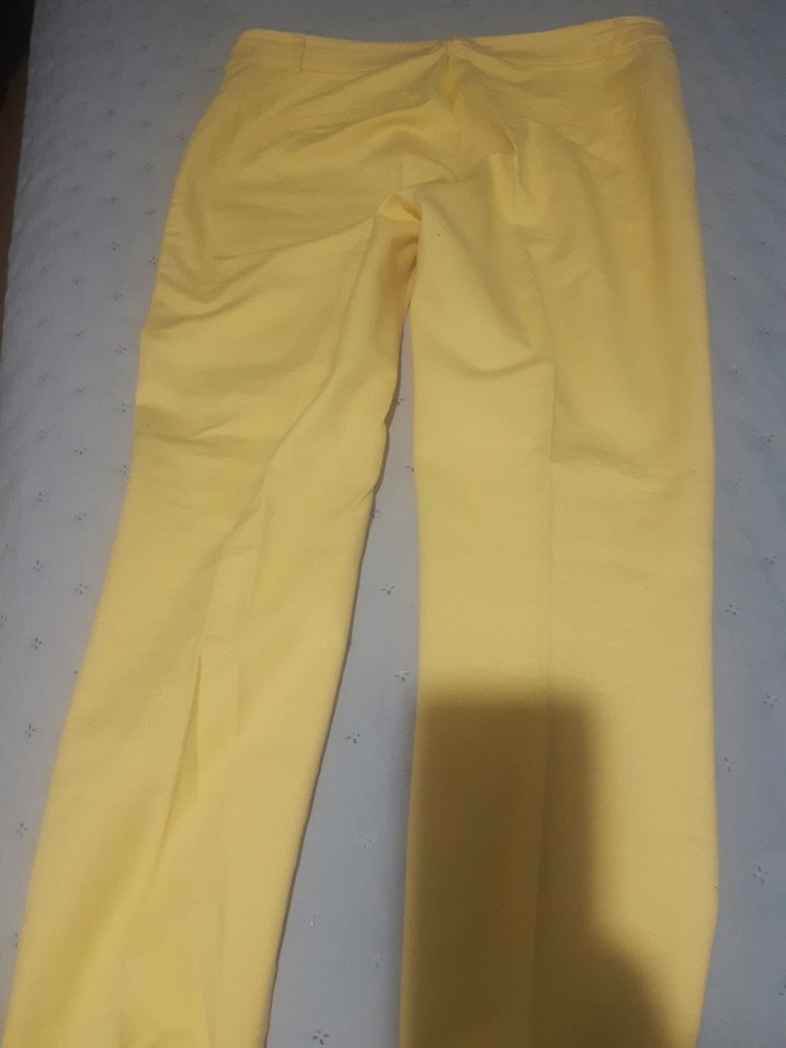 Sarı midi boy kumaş pantolon, normal kesim, parlak yüzeyli ve sade tasarımlı, ofis kullanımına uygun.