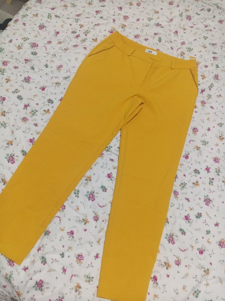 Sarı renkte, normal boyda midi kumaş pantolon. Regular fit ve kemerli, günlük ve sokak stiline uygun.
