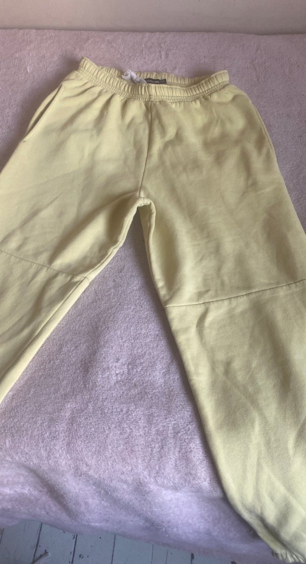 Kadınlar için rahat kesim, pastel sarı midi uzunlukta, yumuşak ve sıcak kumaştan yapılmış, elastik bel bantlı sweatpant. Günlük sokak stili için uygun.