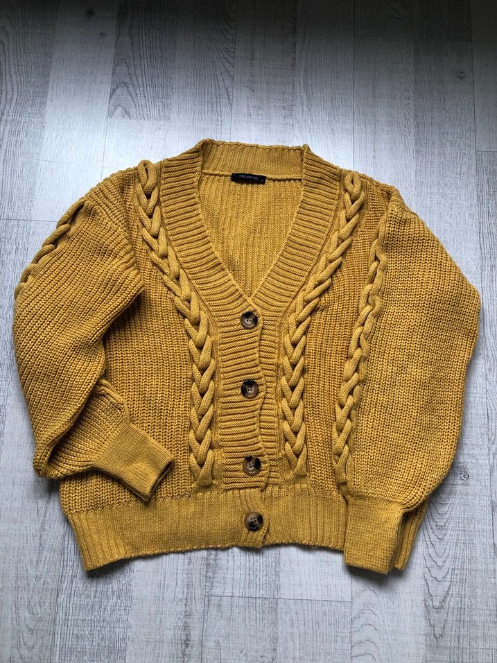 Kadınlar için örgü dokulu, uzun kollu ve bol kesim bir hırka. V yaka ve düğmeli, rahat ve bohem tarzda. Canlı sarı rengiyle trend bir görünüm sunar. ☀️