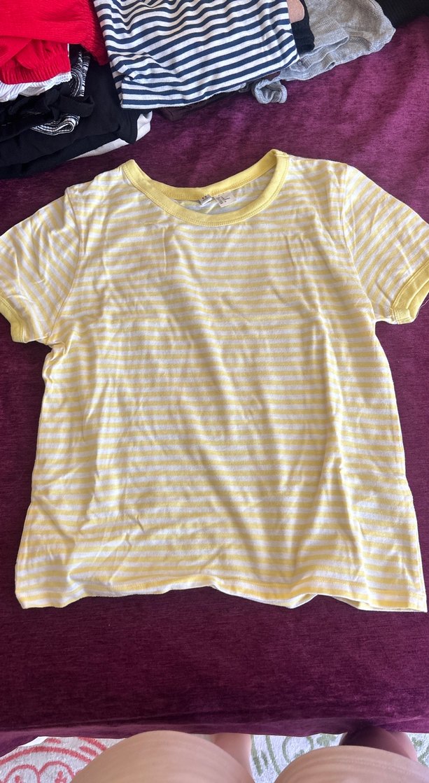 Pamuklu, kısa kollu, yuvarlak yakalı, pastel sarı tonlarında, bol kesim kadın tişörtü. Rahat ve şık sokak stili için uygun.
