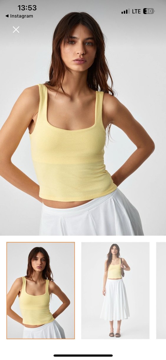 Pamuklu kumaştan üretilmiş, sarı renkli, V-yaka ve kolsuz, vücuda oturan crop top. Minimalist tarzıyla rahat ve şık kullanım sunar. (Yanlışıkla xs aldım ve dar geldi, iade süresi geçtiği için iade edemedim. Etiketi üstünde paketinden hiç açmadım yepyeni ürün)