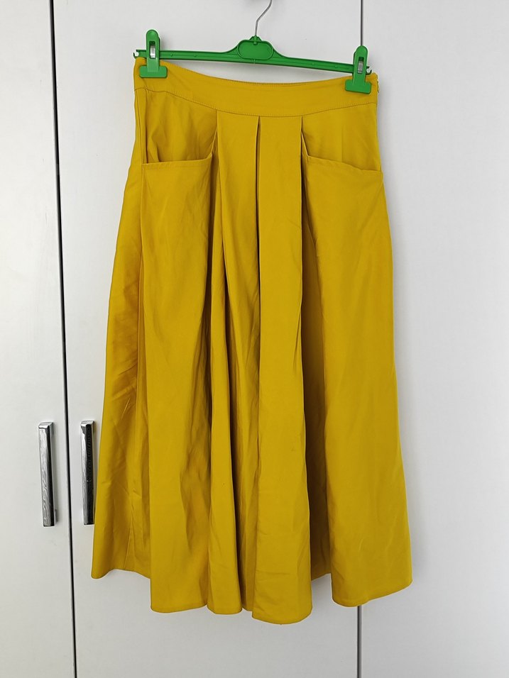 Kadınlar için pilili, bol kesim ve parlak sarı ipekimsi kumaştan etek. Günlük kullanıma uygun bohem tarzda.