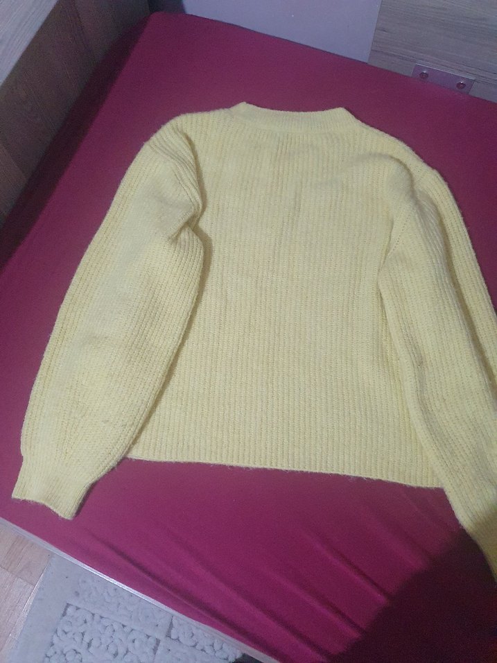 Pastel sarı renginde, bisiklet yakalı, uzun kollu, bol kesim triko kazak. Günlük kullanım için yumuşak ve rahat dokuma kumaş.