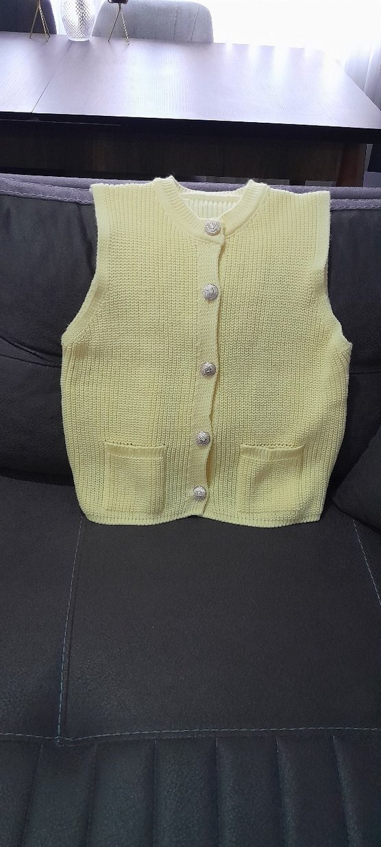 Sarı renkli, triko dokulu kadin yeleği, düğmeli ve bisiklet yaka. İki ön cepli, rahat sokak stili için uygun.
