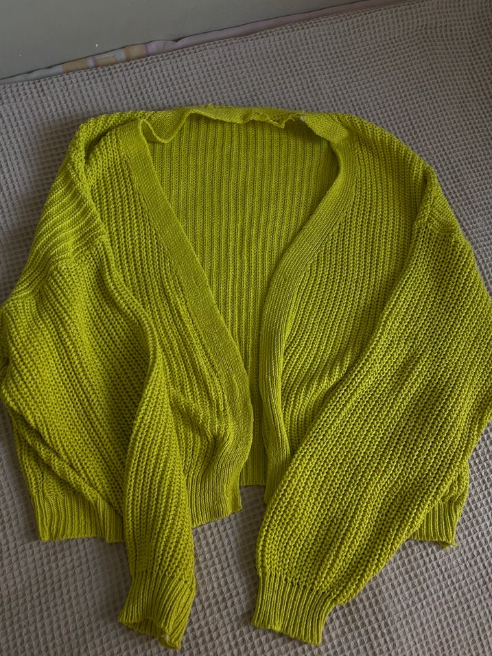 Sarı renkli, uzun kollu, triko kumaştan geniş kesim kadın hırka, rahat ve gündelik tarz için uygundur.