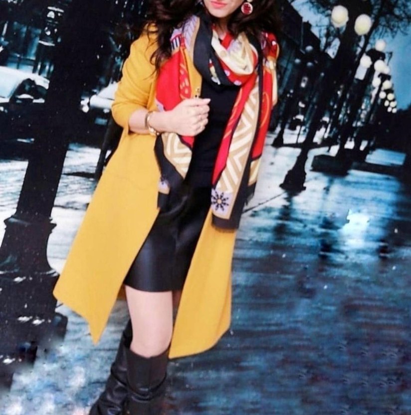 Kadınlar için sarı renkte, uzun kesim, salaş tarzda, etnik desenli, sentetik kumaştan yapılmış, yakası kesik ve uzun kollu kaban. Günlük kullanım için uygundur. Zara değildir, kusursuz.