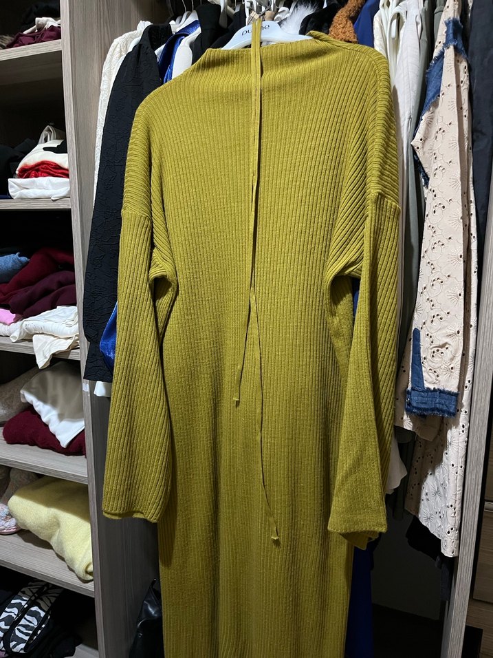 Kadınlar için sarı renkli, boğazlı, uzun kollu ve uzun kesim triko elbise Rahat, bol kesimli ve sade tasarımlı, günlük kullanıma uygun.