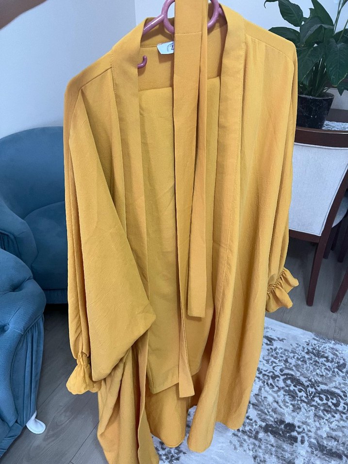 Kadınlar için uzun, salaş kesim, parlak sarı renkte, desen içermeyen, minimalist sokak stili uzun kollu kimono.