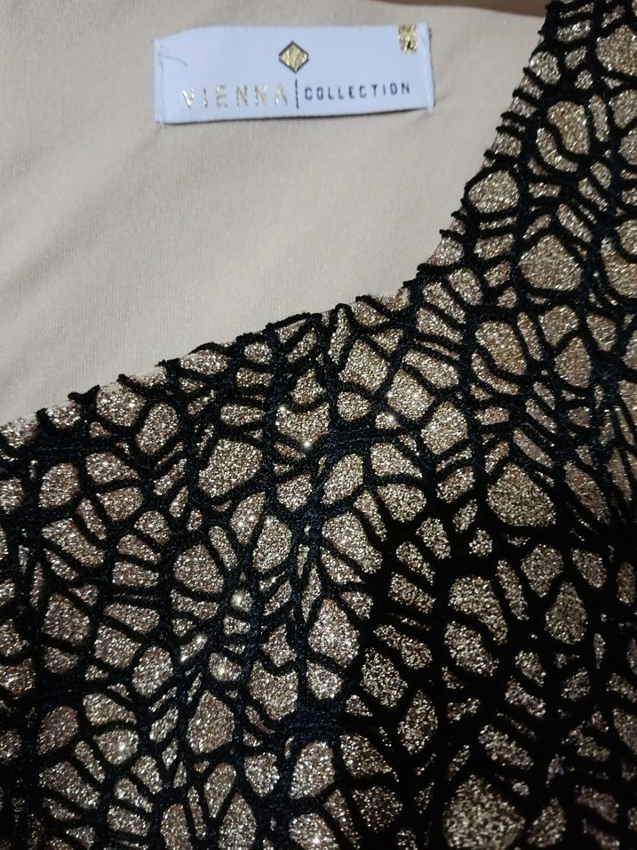 Kadınlar için vücuda oturan, koyu sarı yılan desenli uzun abiye. Siyah dantel detaylı ve kayık yaka, ince askılı kollu, parti için uygun.