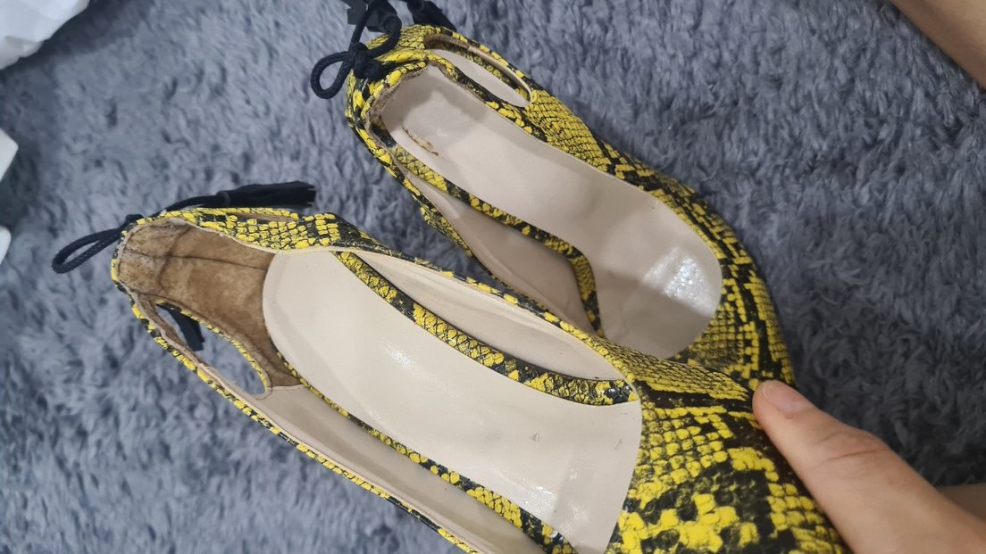 Sarı yılan desenli, tokalı ve ince topuklu kadın stilettoları. Kauçuk malzemeden üretilmiş, günlük kullanıma uygun şık bir tasarım.
