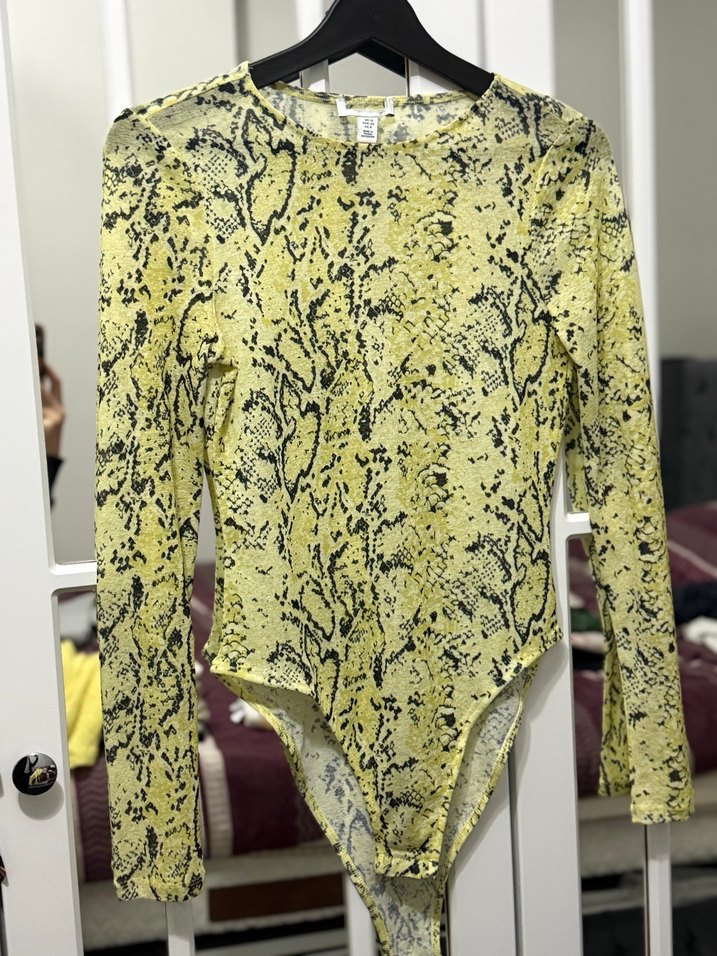 Dar kesim, uzun kollu sarı yılan desenli bluz. Dantel detaylı, yumuşak sentetik kumaştan, sokak stiline uygun. Mango marka