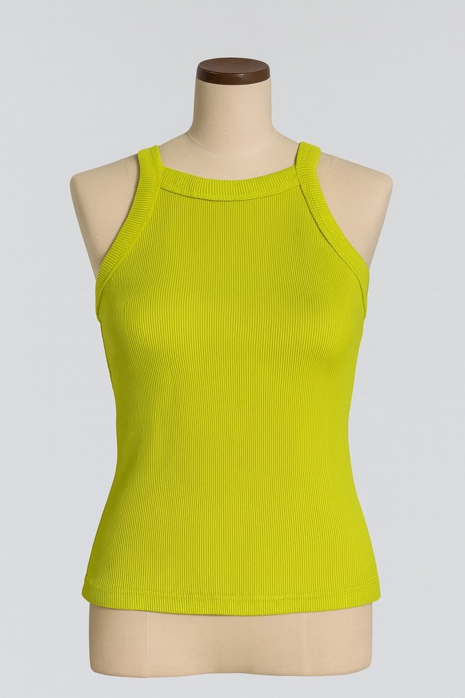 Yüksek yakalı ve kolsuz, sarı renkli, vücuda oturan kadın atlet. Yumuşak sentetik kumaştan, desen içermeyen minimal tasarım, günlük kullanım için uygun. Marka temsilidir