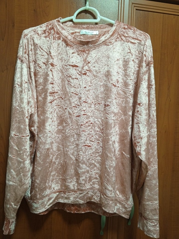 Yumuşak kadifeden şeker pembesi renkte, uzun kollu, yuvarlak yakalı ve bol kesim kadın bluz. Spor kıyafetle de kullanılabilir. M beden yazıyor ama L ye de olur.