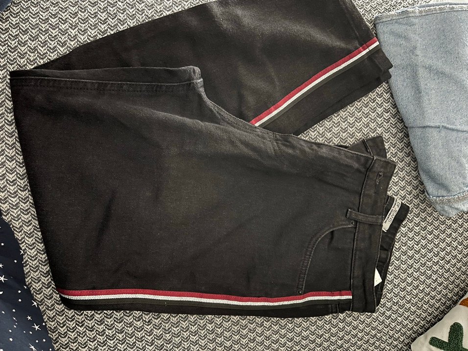 Kadınlar mom fit kesimde, dayanıklı denim kumaştan yapılmış siyah jean. Yanlarda kırmızı ve beyaz ince şeritler bulunur. Günlük sokak stili için uygundur.