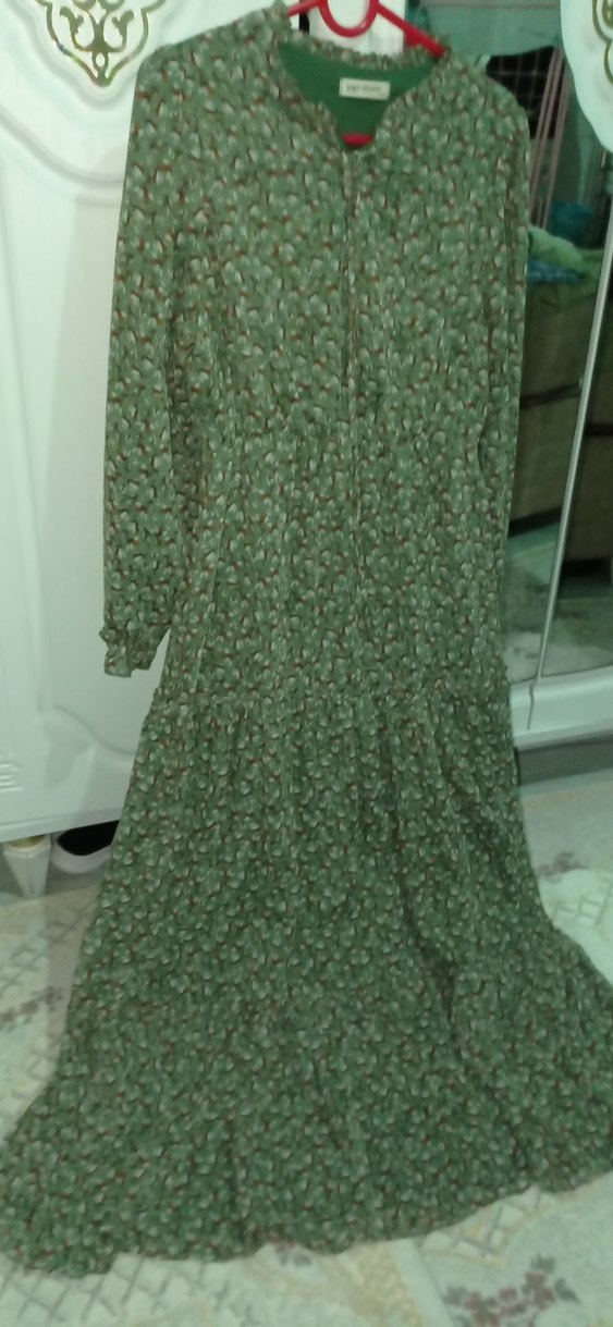 şifon elbise Uzun kollu, salaş kesim ve bisiklet yaka olan bu elbise, yumuşak sentetik kumaştan yapılmıştır. Koyu haki tonunda, drapeli ve bohem tarzındadır.