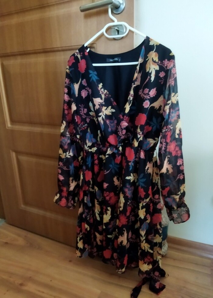 Elbise hiç giyilmemiştir. Şifon,kısa önü v yaka kuşaklı kolları uzun tül olup çiçekli romantik bir elbisedir.