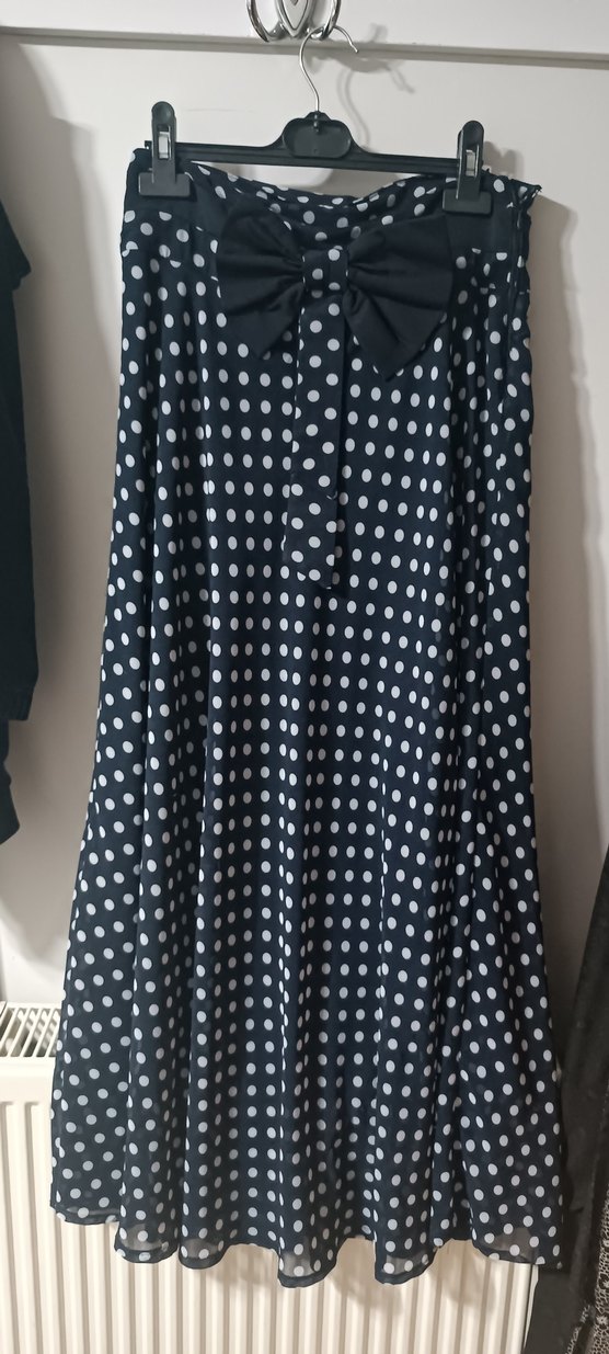 Kadınlar için şifon yazlık lacivert zemin üzerine beyaz puantiyeli,arkası fiyonklu, bol kesim vintage goth tarzı uzun etek. Yumuşak sentetik kumaştan üretilmiştir.