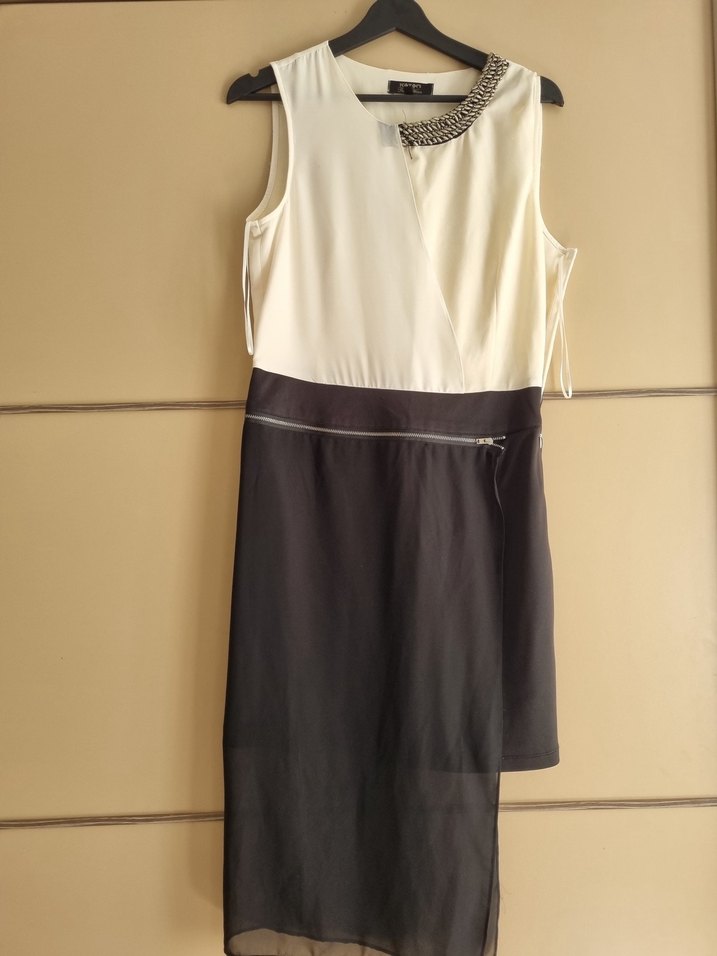 Ürün bir defa kullanılmış olup 40 bedendir. Boyu tülsüz 77, tül ile 107 cm’dir. Bel 40, göğüs 46 cm’dir. Üst rengi kırık beyaz , krem tonlarında olup yaka kısmında iki belirsiz nokta vardır.
