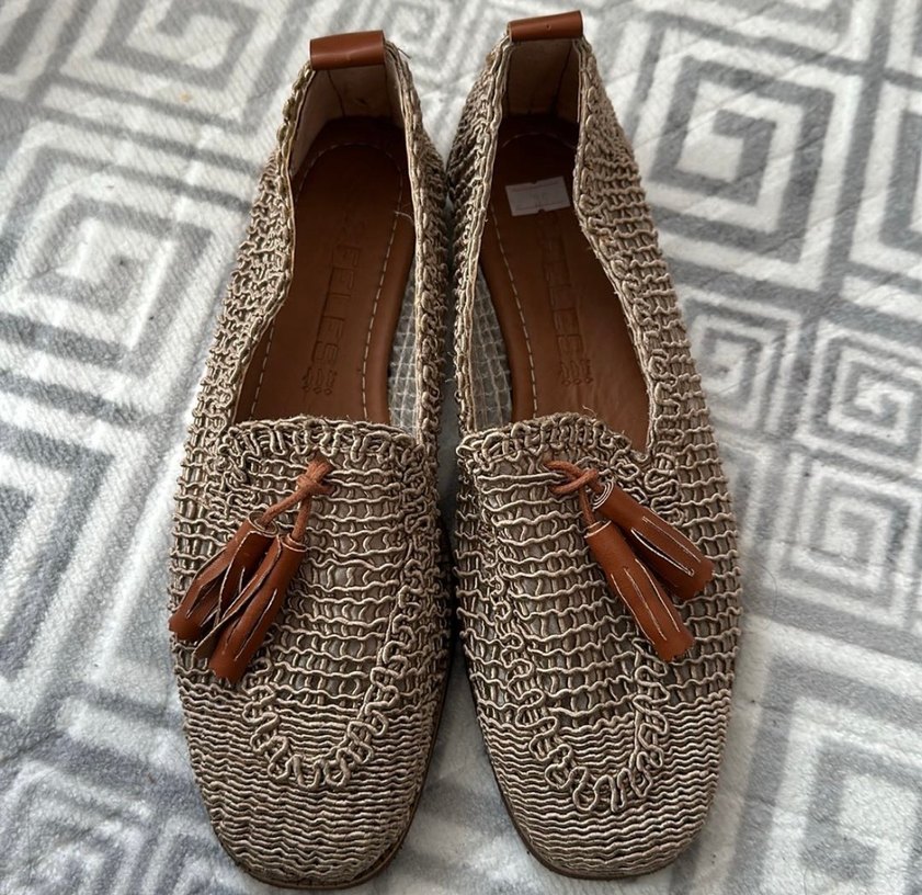 Bej renkli örgü kumaştan yapılmış,püsküllü, bohem tarzda rahat kadın babetleri. Günlük kullanıma uygundur. Hiç kullanılmadı