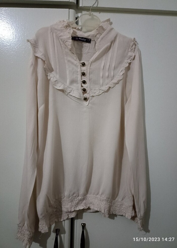 Yazlık ince pamuklu rahat, şık bir bluz.Ceket içlerinde de kullanılabiliyor.36-38 uyumlu krem rengi, herhangi bir yırtılma, kusur vs.yok.