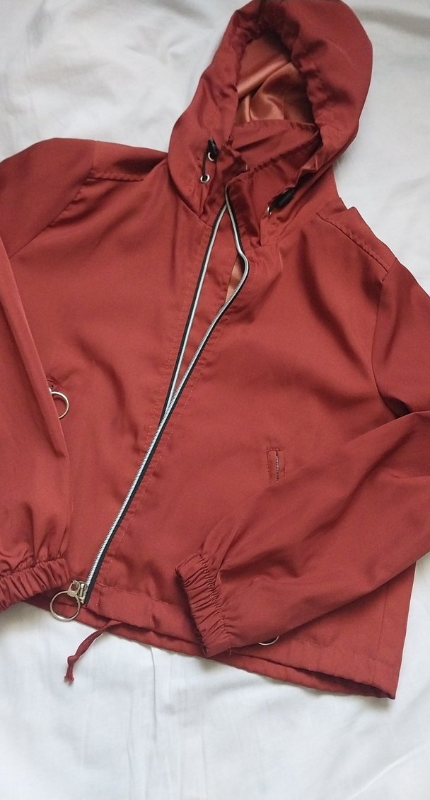 Kadın ceket, notalı yaka ve uzun kollu, bol kesimdir. Parlak kiremit kırmızı renkte, fermuarlı, sentetik kumaştan, günlük kullanım için uygundur.