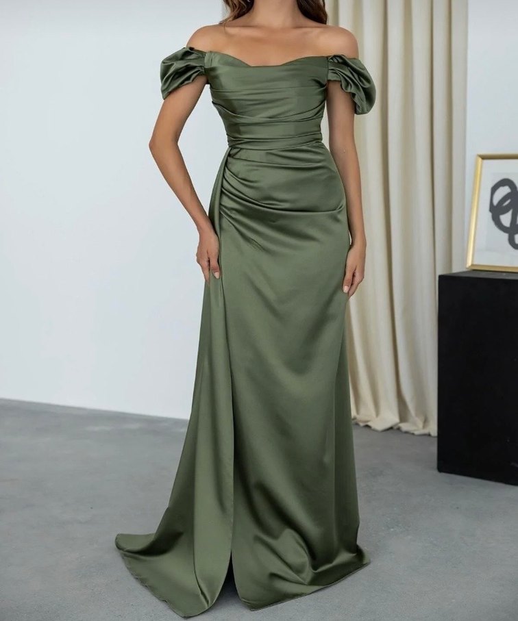 Parlak haki renkli uzun elbise, drapeli tasarım, kayık yaka ve kısa kollu. Düzenli kesim ve modern klasik tarzda, düğünler için uygundur. ✨