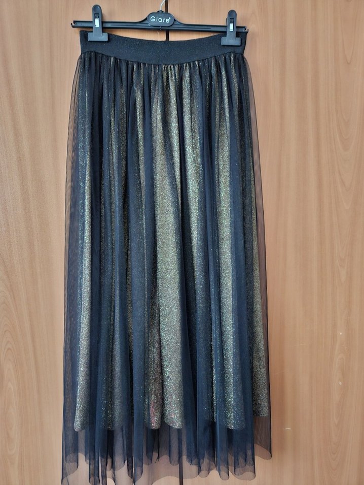 Kadın sarı simli tül etek, beli lastikli 38 beden gece partileri için uygundur. ✨