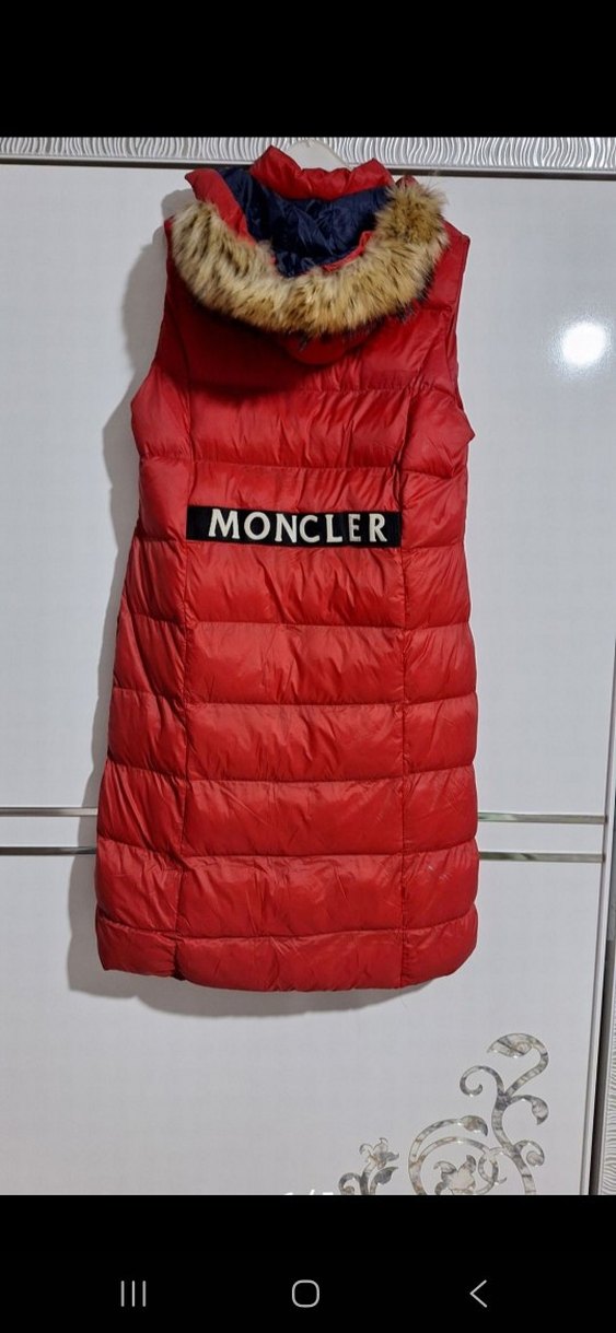 Kürk detaylı kapüşonlu, kırmızı, kolye yelek. Orta boy, normal uzunlukta, yumuşak ve sıcak kumaştan. Sırtında büyük MONCLER baskısı bulunur. Rahat ve renkli stil sunar. orijinal oaz tüyünden yapılmıştır