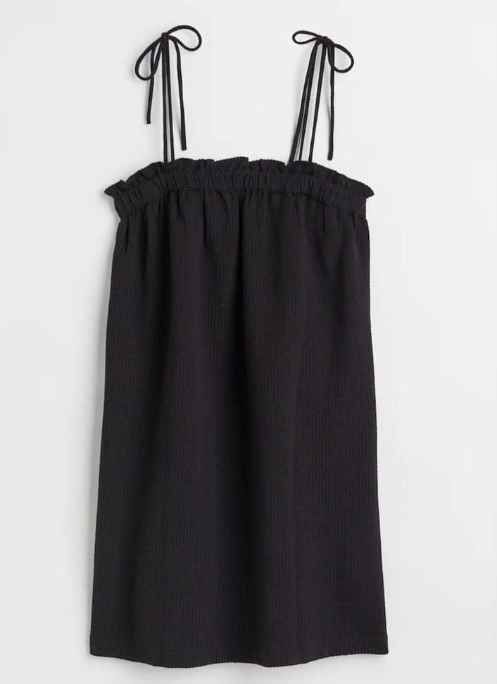 Siyah midi boy, askılı ve straplez yaka kadın elbise. Keten kumaştan, bol kesim ve pile detaylı, minimalist sokak stili için uygun.