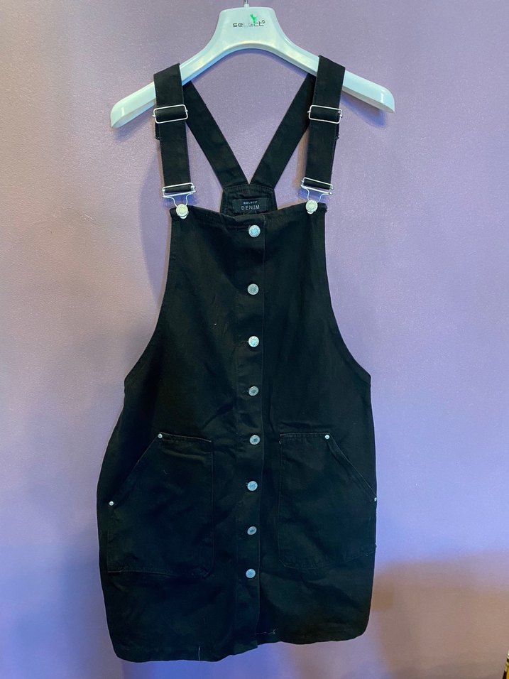 Siyah askılı, tokalı kayışlara sahip midi uzunlukta, bol kesim kadın salopet. Günlük kullanıma uygun, sokak stilini yansıtır.