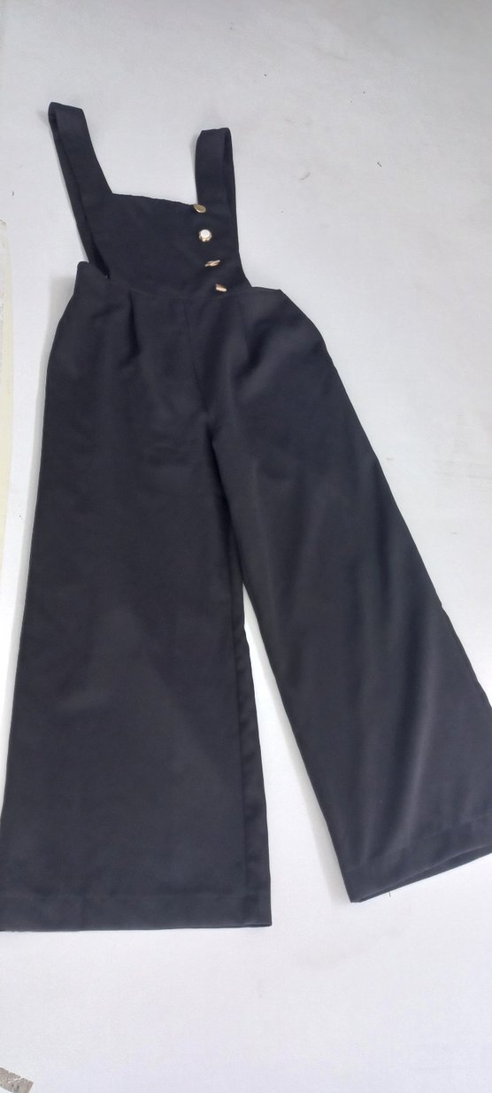 Kadınlar için düğmeli, regular fit ve uzun boy kumaş pantolon tulum Siyah renkte, ipeksi dokuda ve minimalist normcore tarzında, ofis kullanımı için uygundur. az kullanilmistir hcbir defosu ve yirtigi yoktur tek sorun ekstra bir dugme deligi acilmistir fotografta vardir gorsel