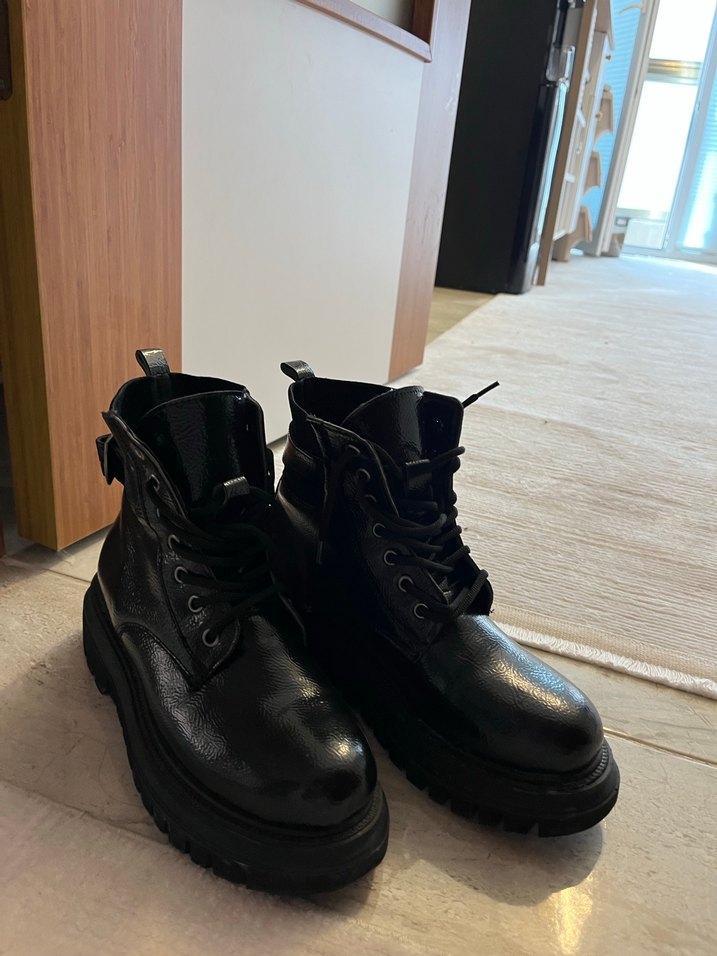 Siyah renkli, lastik malzemeden yapılmış, tokalı ve platform topuklu kadın botu. Goth tarzını yansıtır, günlük kullanıma uygundur. bi kere kullandım denemek için sıktığı için kullanılmadı sıfır